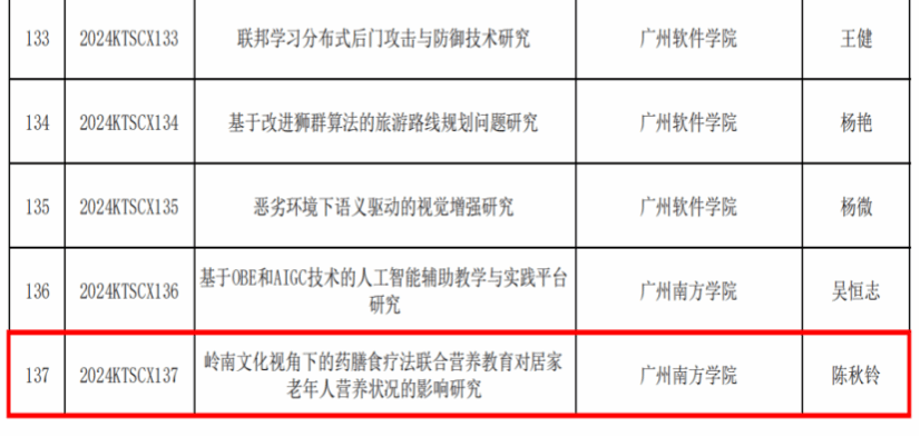 近日,2024年广东省普通高校特色创新类项目立项名单,公司陈秋铃博士主持的项目《岭南文化视角下的药膳食疗法联合营养教育对居家老年人营养状况的影响研究》喜获立项,该研究拟结合岭南地域特点,开发适合居家老年人的药膳食疗法联合营养教育方案,旨在提高居家老年人的营养知识水平和健康素养,进而改善居家老年人营养不良状况,推进健康中国战略。