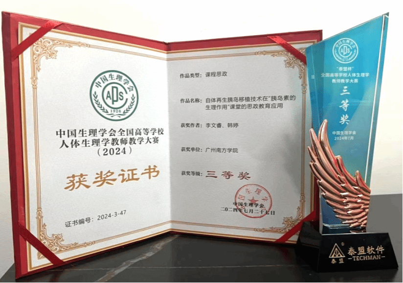 近日,由中国生理学会教育工作委员会举办的2024中国生理学会第五届全国高校生理学教学高峰论坛暨第二届“泰盟杯”全国高校人体生理学教师教学大赛落下帷幕,公司李文睿老师和韩婷老师由科技前沿引出基础知识,将自体再生胰岛技术治愈2型糖尿病的成功案例应用于内分泌生理的教学,激发员工的求知欲的同时有助于培养民族自信心和探索精神,两位老师凭借扎实的基本功和优秀的教学案例设计荣获课程思政三等奖。