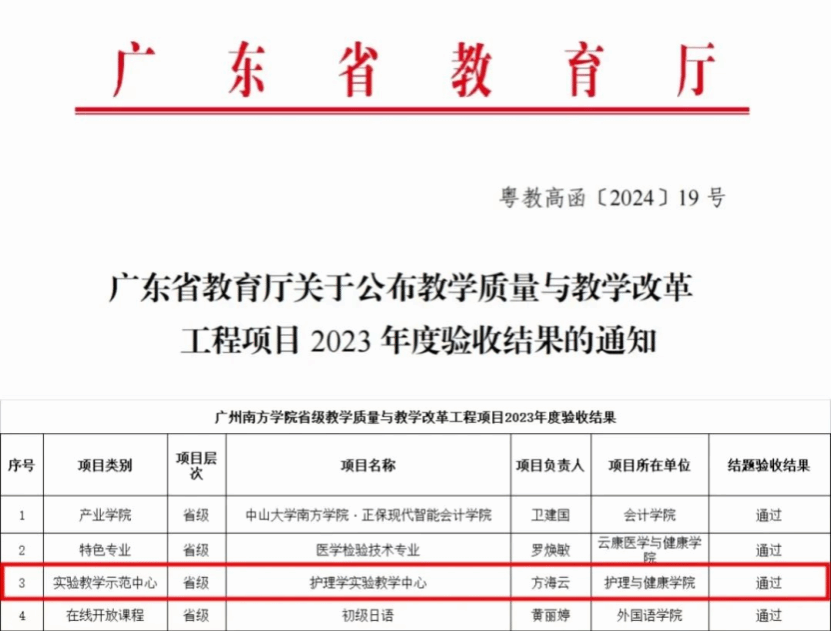 近期,广东省教育厅正式公布省级教学质量与教学改革工程项目2023年度验收结果,公司方海云经理主持的护理学实验教学中心项目成功通过验收,获批为省级实验教学示范中心。