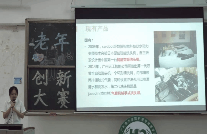 第五组展示的产品是一款可以自动洗头的装置——“智慧洗发师”。小组成员从老年人难以独立完成洗头和照护者劳动强度大两个角度出发,设计出集洗头、烘干、按摩于一体的全自动洗头机,解放老年人的双手,更好地帮助老年群体解决“洗头难”这一痛点。