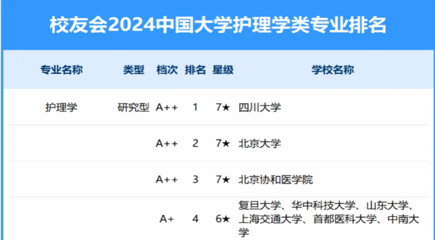 (员工会2024中国大学护理学类专业排名榜单节选)