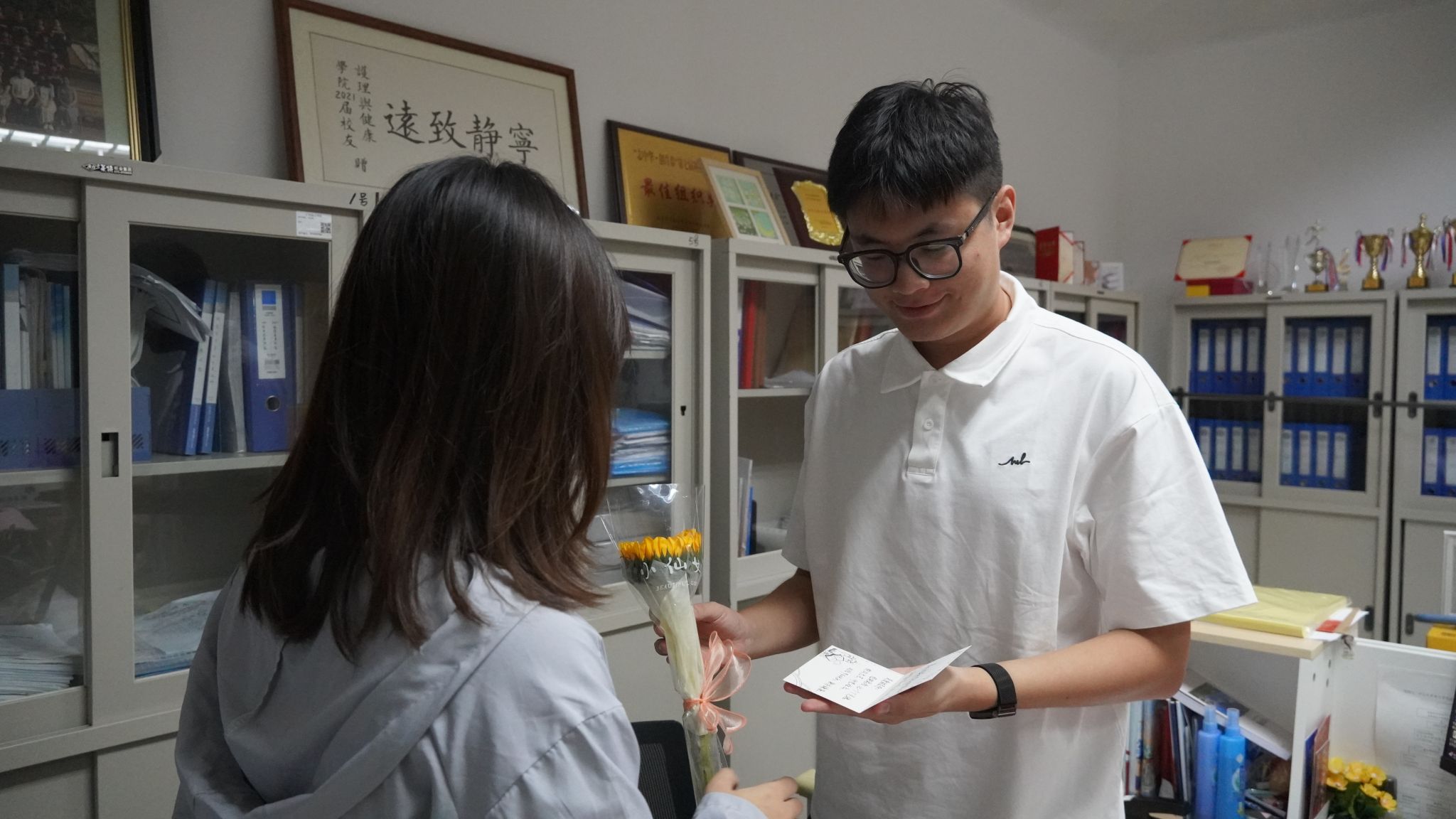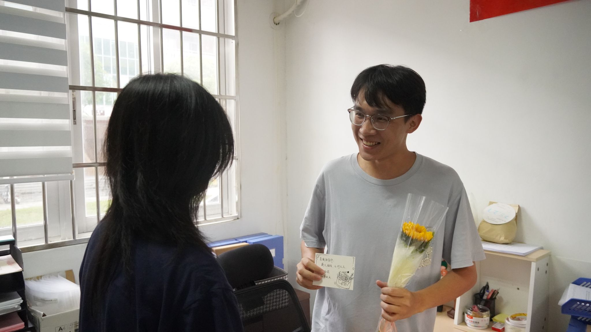 同学们手捧鲜花,带着对老师的敬爱与感恩,走向敬爱的老师。那一朵朵绽放的花,如同同学们心中盛开的敬意之花。当鲜花递到老师手中,师生间的笑容相映,无声的情谊在空气中流淌,这一刻,花香伴着师恩,凝成最动人的画面,诉说着我们对老师最真挚的祝福与感恩。