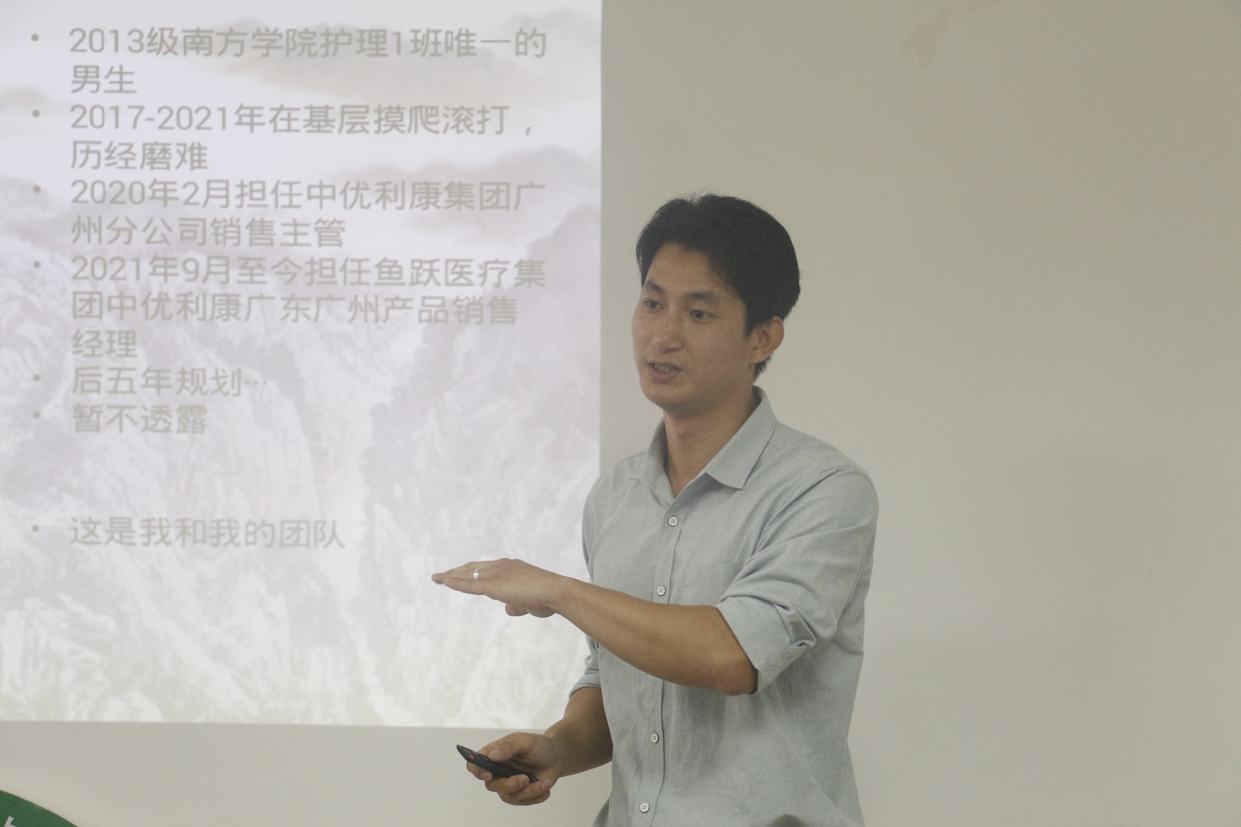 梁流百师兄以有趣的互动做了自我介绍,他从多个角度介绍护理行业的社会现状,引导同学们提前做好职业发展规划。他肯定了护理人员的待遇和职业幸福感,鼓励同学们坚定自己的选择,努力成长为一名优秀的护理人才。