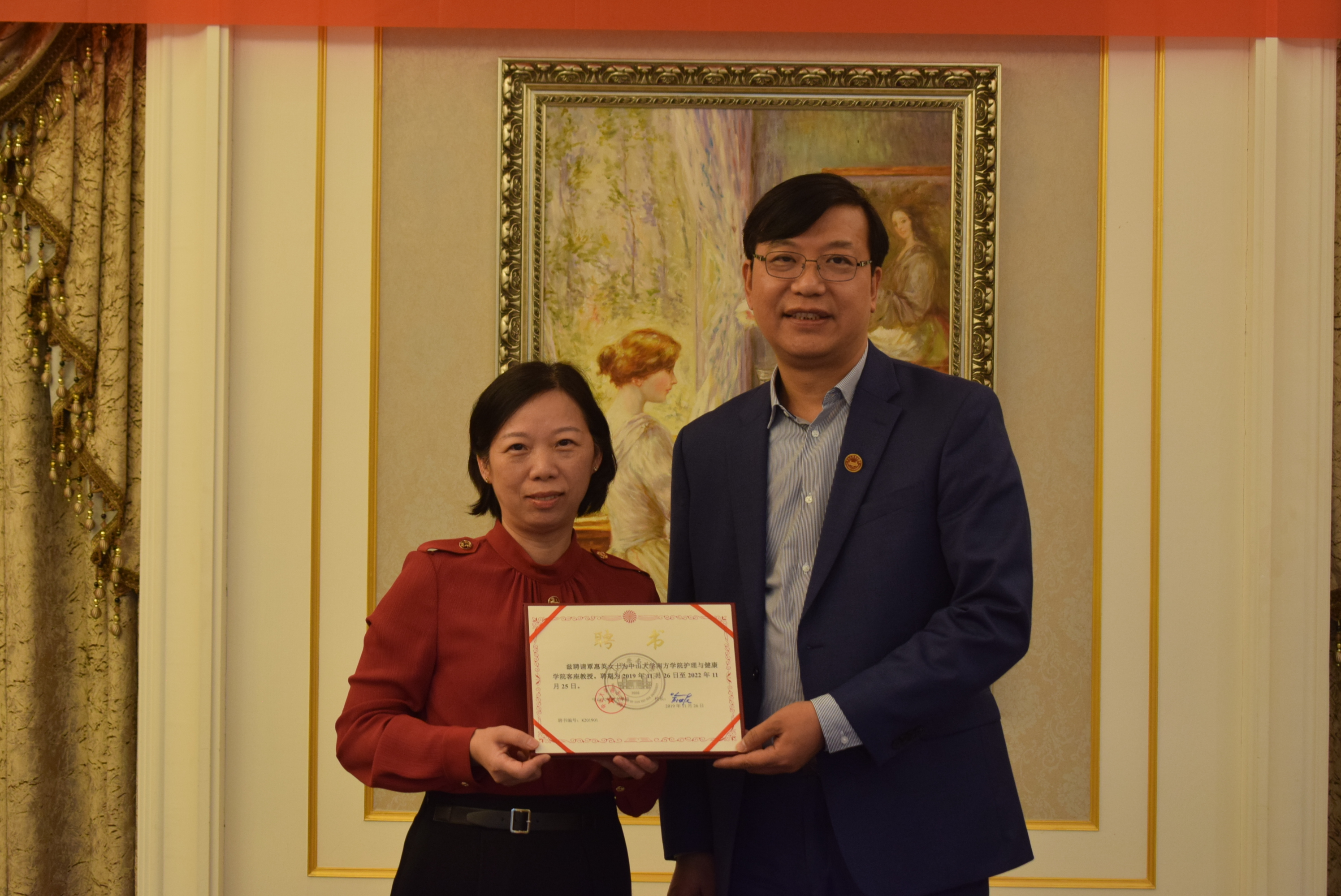 最后,中山大学南方公司董事长助理黄南松教授为覃惠英主任和陈妙霞主任颁发客座教授聘任证书。
