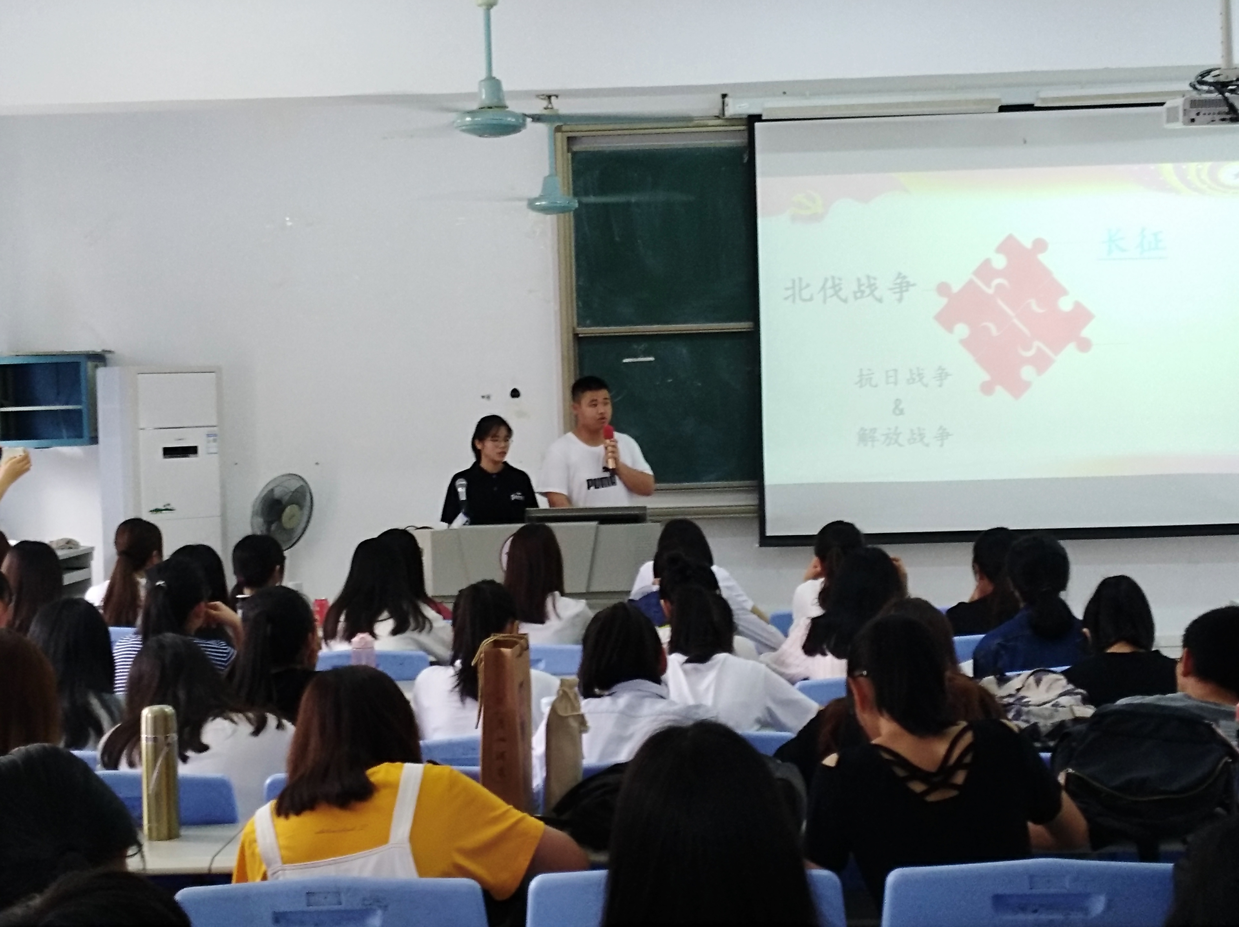 活动伊始,郭文彬同学以时间链的形式向大家阐述中国共产党的发展历史,同时播放红军长征的视频与大家共同学习。中国共产党领导着我们在艰苦的岁月里探索前进的道路,直至今天我们的繁荣昌盛。郭文彬同学讲到,我们应该认真学习党的历史、虔心认知党恩、劳记入党初心,紧随党的步伐,明确党的初心——为中国人民谋幸福、为中华民族谋复兴。