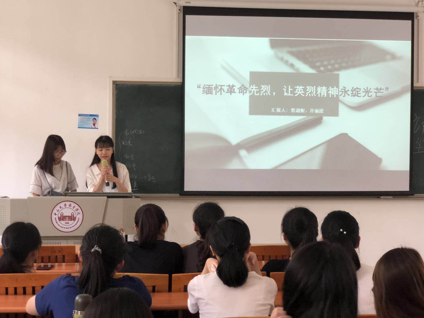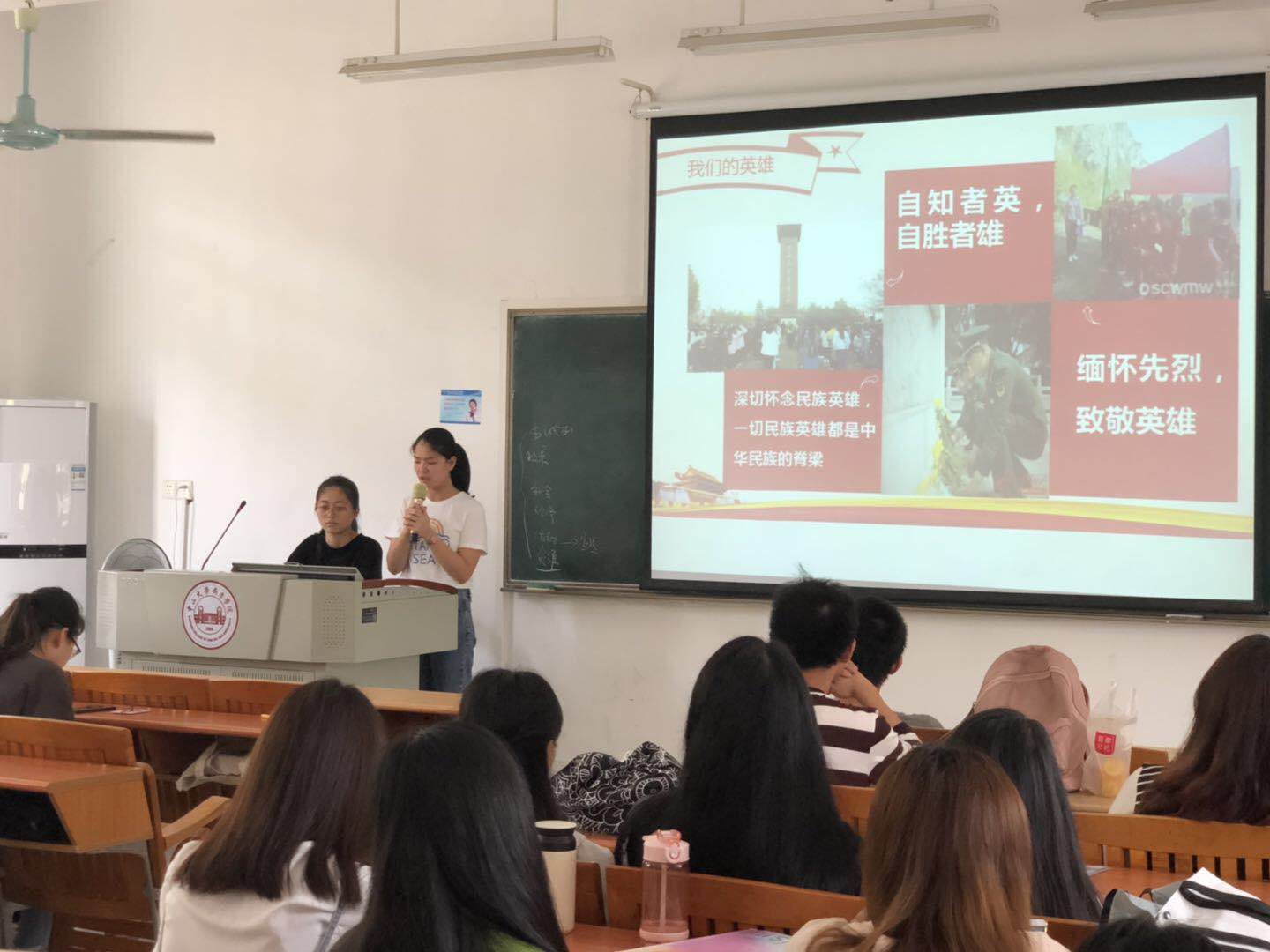 第四组为张舒颖、丁丽瑄。两位同学以习近平总书记在颁发中国人民抗日战争胜利70周年纪念章仪式上的讲话为引,“一个有希望的民族不能没有英雄,一个有前途的国家不能没有先锋。包括抗战英雄在内的一切民族英雄,都是中华民族的脊梁。”,讲述英烈挺起了让世人钦佩的民族高度,人民更要把他们永远放在心中。今天,我们深切缅怀英雄功绩,传承弘扬英烈精神,就是为了这国家更好的明天。祭忠魂,存浩气,带上先烈的精神上路,我们继续前行。