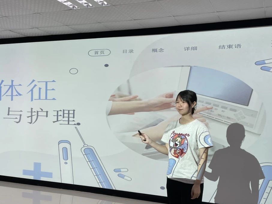 陈晓童同学阐述了生命体征的概念和重要性,并从体温、脉搏、呼吸、血压四个方面展开详细讲解。她细致的向同学们演示体温计和血压计的使用方法,并且强调了使用后护理“两计”的重要性,详细的介绍了护理方法。为了让课堂疑问及时解决,课下不留下疑惑,小老师还穿插了教学视频让同学们对操作更透彻,结合理论知识更加全方位细致学习。