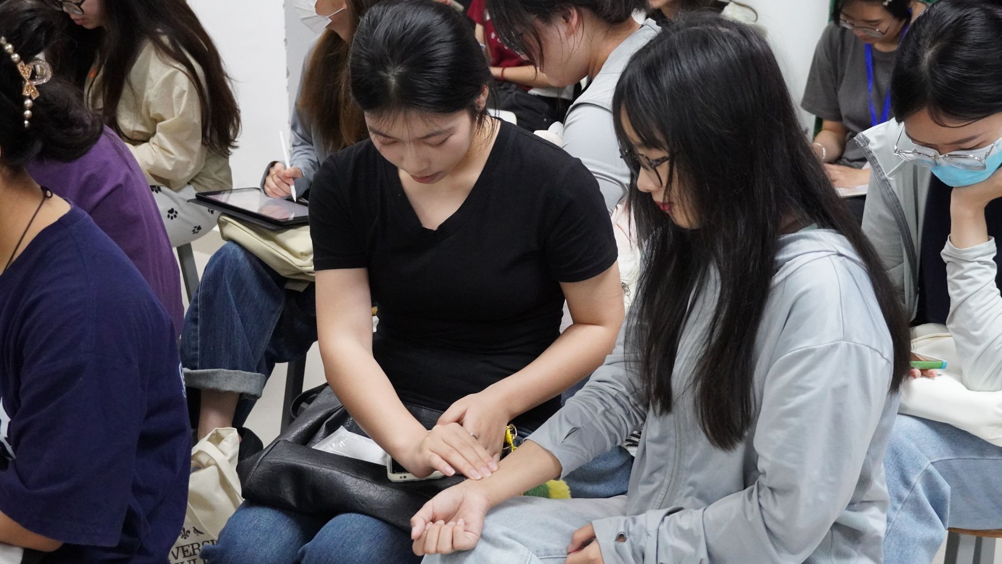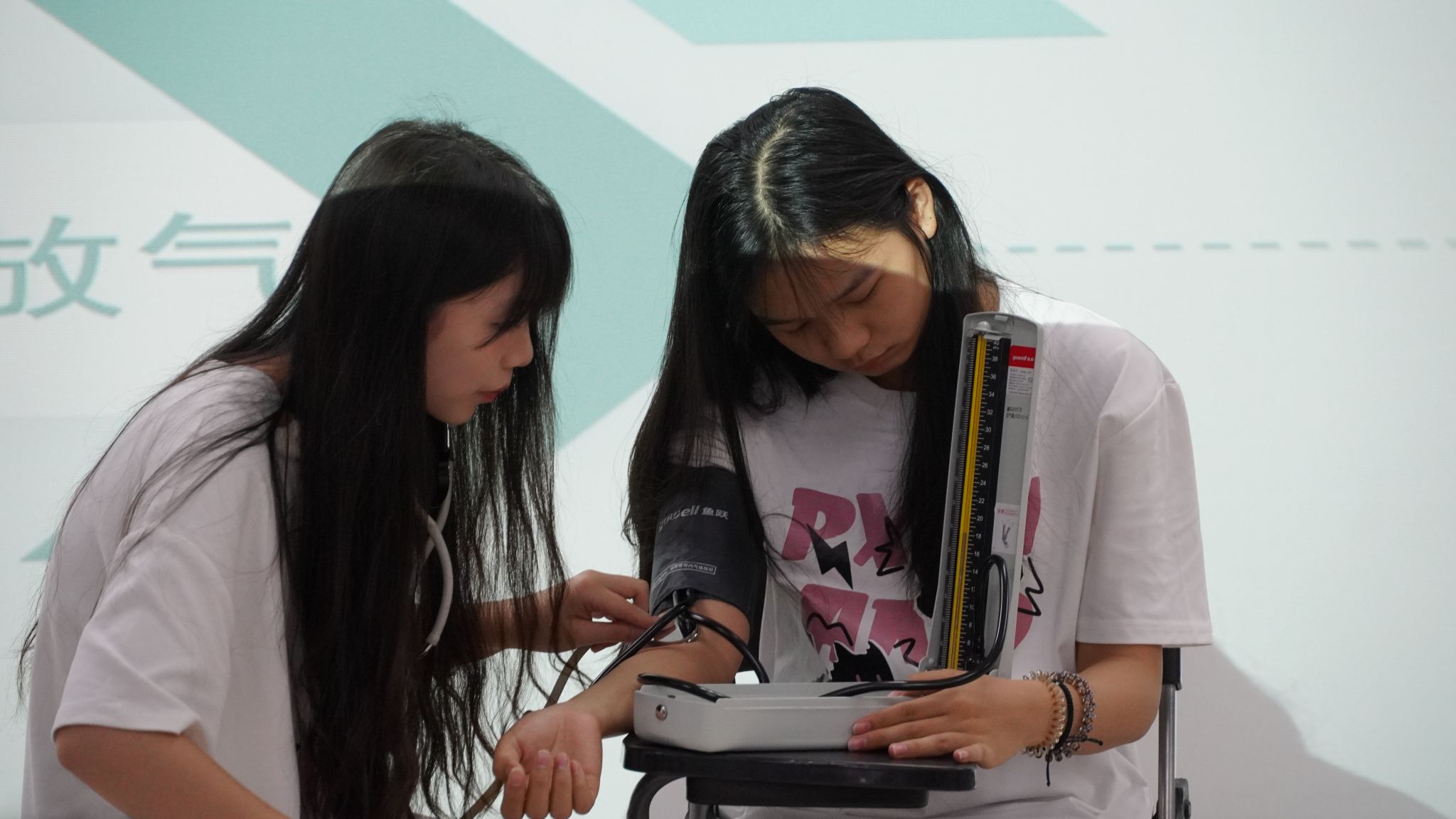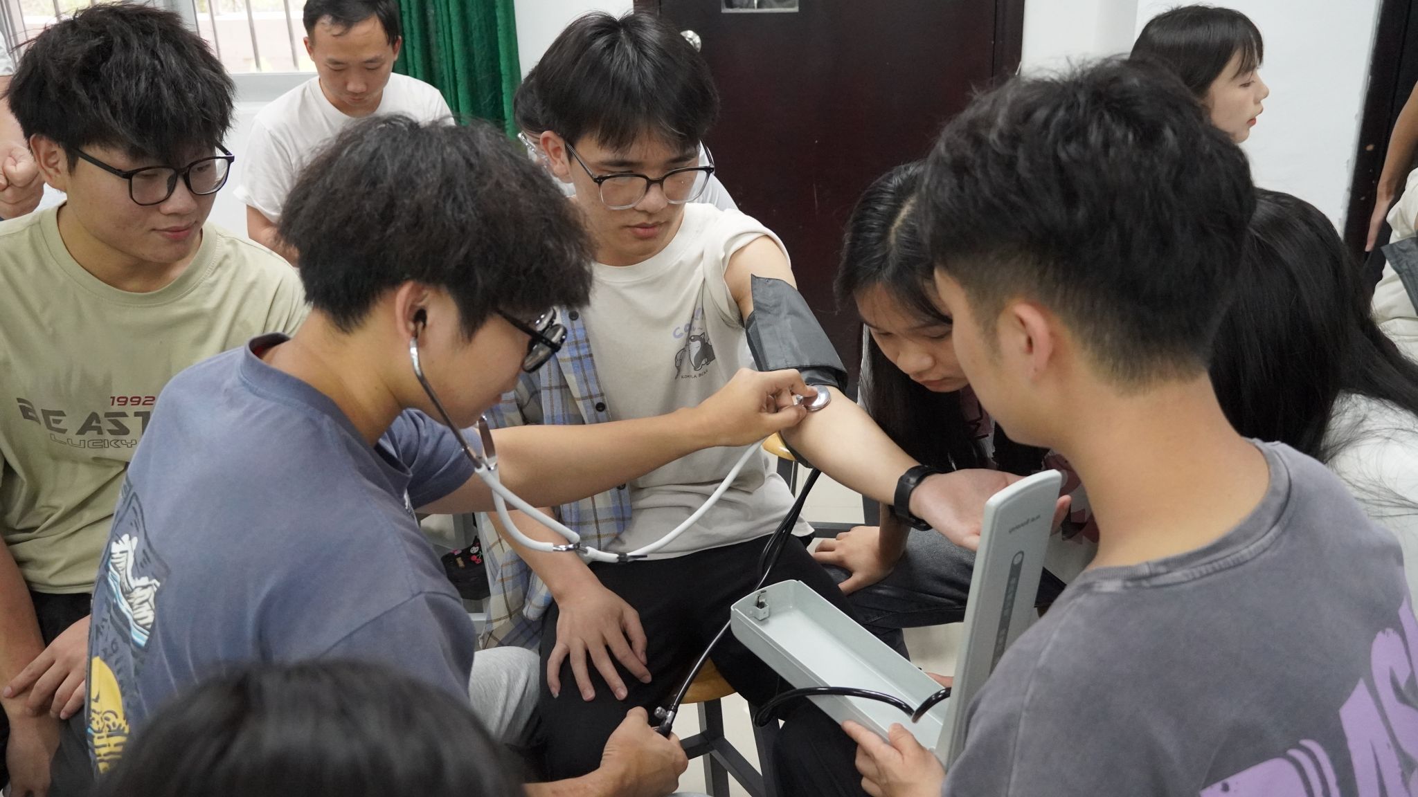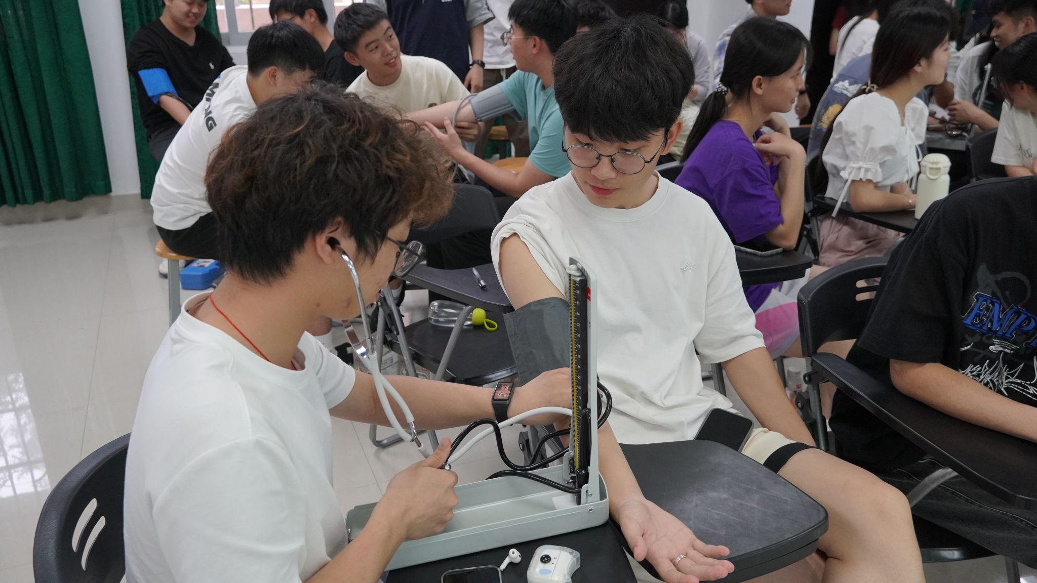 同学们学习热情高涨,专注听讲并踊跃参与实践操作。在小老师细致耐心的指导下,同学们都正确地掌握了测量生命体征的方法。