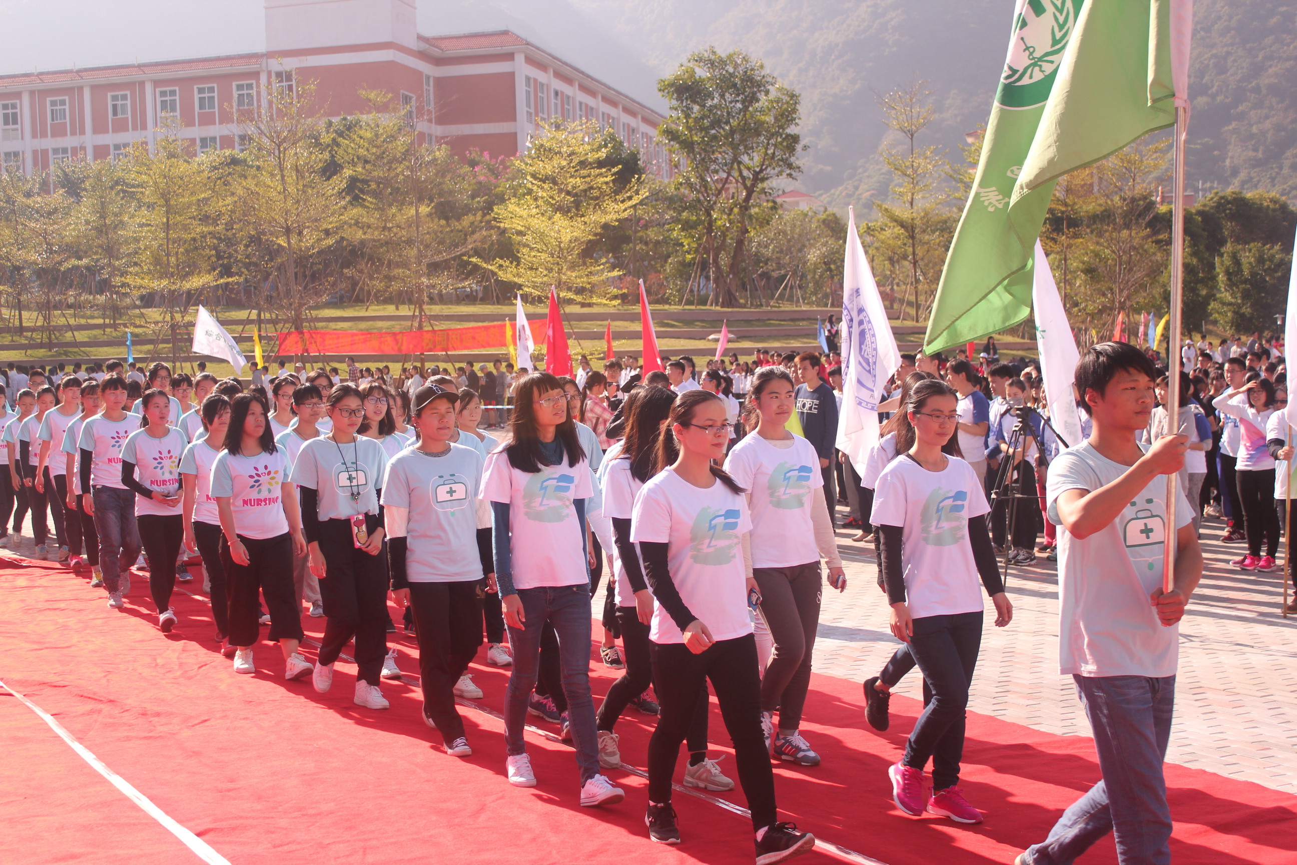 我系师生组成了一支专属我系的白衣天使队,同学们在环跑过程中团结一致,喊着洪亮的口号“白衣天使无限爱,常将他心比我心,护理有我,南方同行”。一路上,整齐有序,在校园的道路上努力奔跑着,充满青春的气息,展现了我系活力向前,奋发向上的迷人风采。