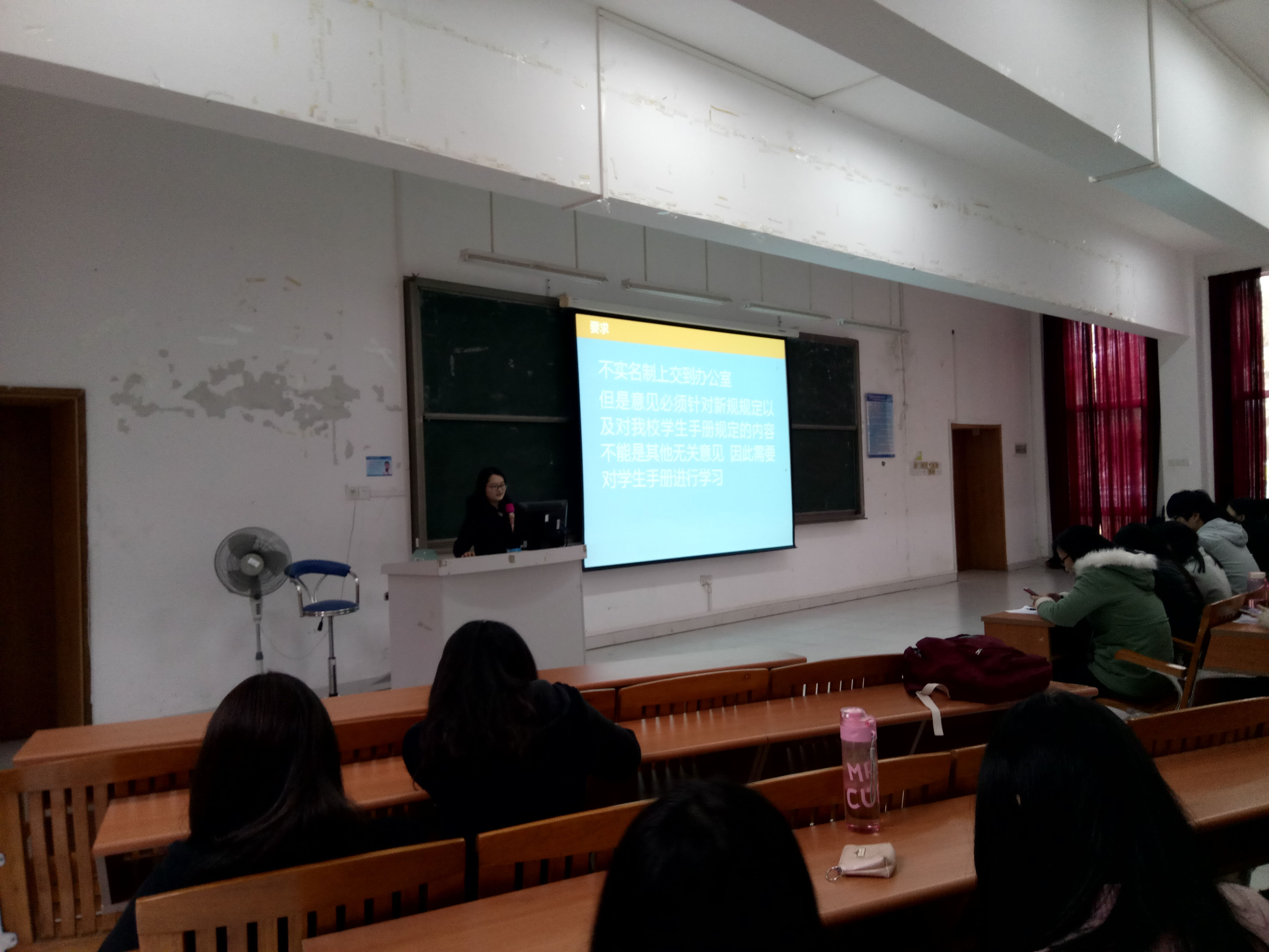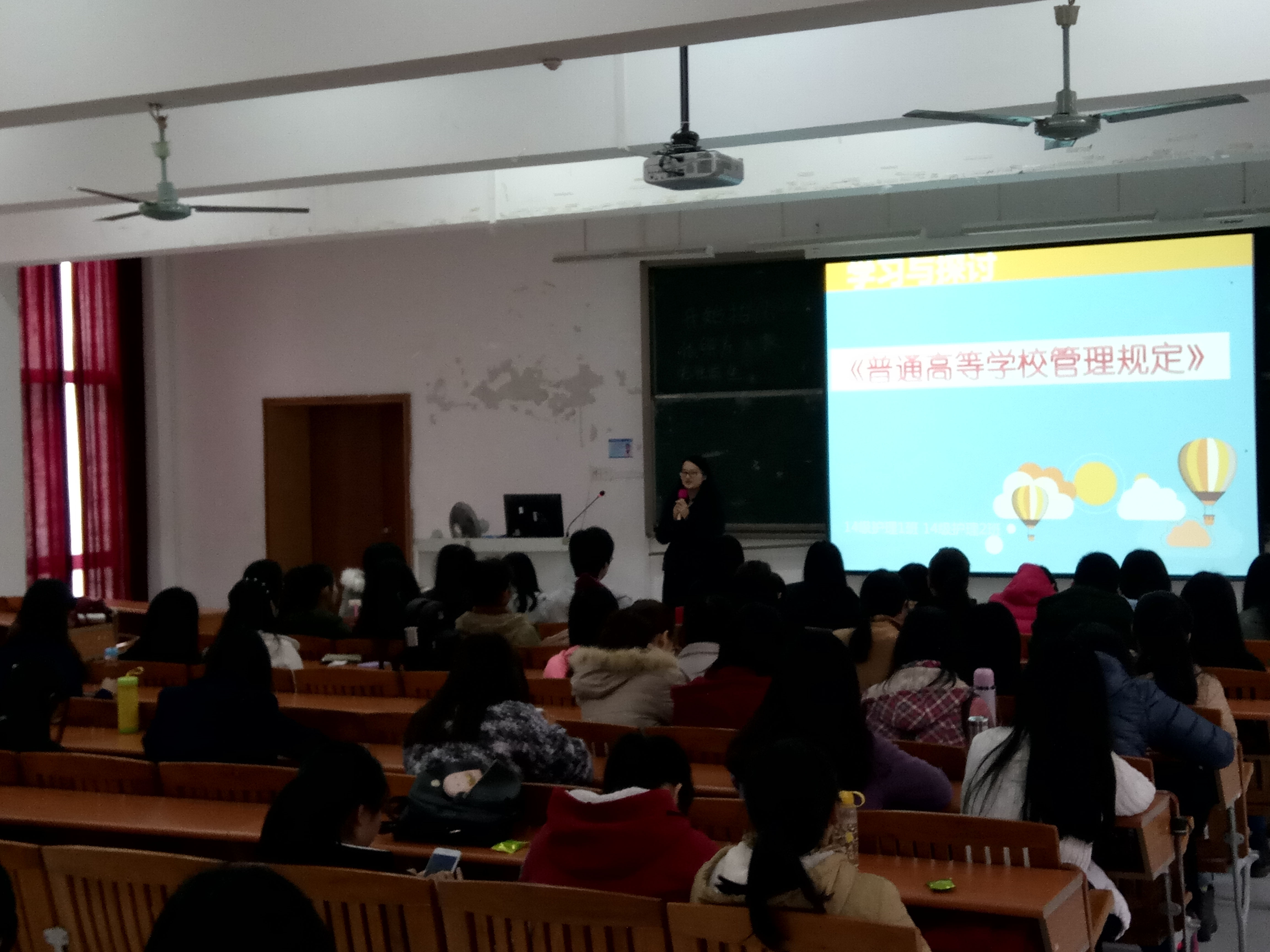 2017年3月13号下午16:55分,健康与护理系辅导员林晓兰、教学秘书刘嘉韵以及健康与护理系2014级全体同学在7教105开展了新学年第一次年级会。会议内容主要是集体学习和探讨关于《普通高等公司员工管理规定》(教育部令第41号),简称《规定》修改的相关内容。