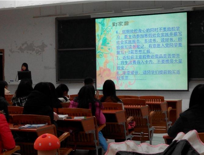 于26日晚19点,健康与护理系寒假离校及假期安全教育在7教105顺利召开。辅导员林晓兰和13、14级同学共同出席。