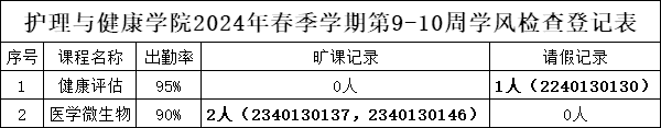下表为2024年春季学期第9-10周学风检查情况,请同学们仔细查看,若发现记录不符请及时反馈。学术部每两周公布学风检查结果,如有异议者,可在公布后一周之内将相关证明发送到邮箱: