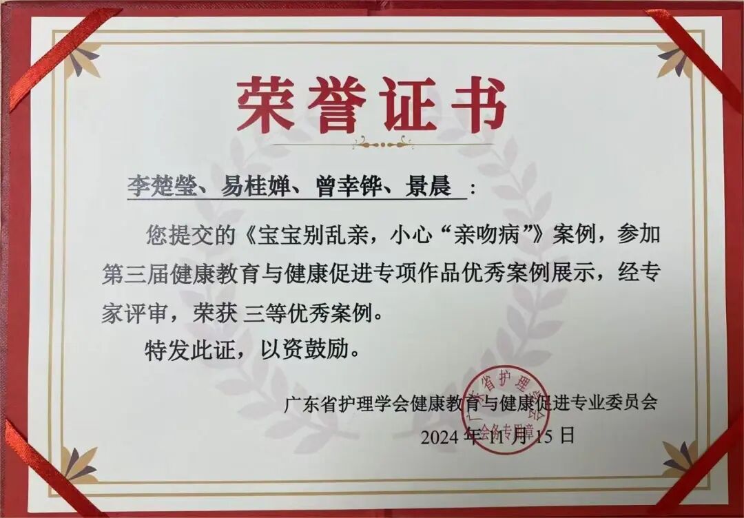 2024年11月15日至11月17日,广东省护理学会健康教育与健康促进专业委员举办健康教育理论与健康促进技术创新培训班暨第三届健康教育与健康促进专项作品优秀案例作品展示,在公司景晨老师的悉心指导下,公司2022级护理学专业李楚瑩、曾幸铧、易桂婵创作的作品《宝宝别乱亲,小心“亲吻病”》荣获优秀案例三等奖。