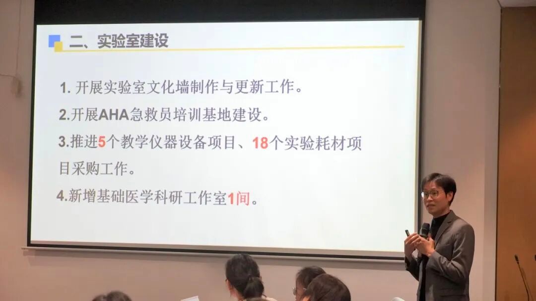 基础医学教研室主任韩婷就课程建设与改革、教科研项目立项及执行、教师获奖情况等工作成果进行了汇报,并阐述了新学期的工作规划。她鼓励教师深耕教学一线,积极参与教学竞赛,主动指导员工赛事,同时坚持以评促建,对标提升,全面推动教学质量与人才培养水平再上新台阶。