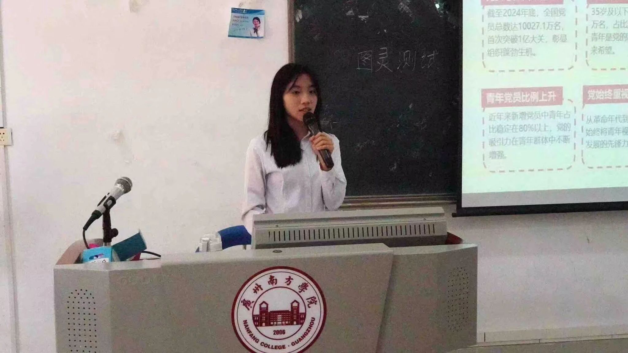 李烨同学则从“为什么要学习党史”切入,结合党员总数突破一亿、青年党员比例持续上升等详实数据,深刻阐释了党对青年一代的高度重视与时代期许。她以重要历史事件为主线,系统梳理党的发展脉络,呈现出一幅底蕴深厚、脉络清晰的红色精神图谱,有效深化了入团积极分子对党史的认知与认同。通过讲述夏明翰、王进喜、黄文秀等优秀党员的感人事迹,她引导同学们以榜样为镜,传承红色基因,将个人成长融入国家发展。最后,李烨同学从“思想筑基、工具赋能、校园践行、生活延伸”四方面指出了新时代青年如何跟党走的行动指南,号召大家努力成长为信念坚定、行动有力、服务同学的新时代准团员。