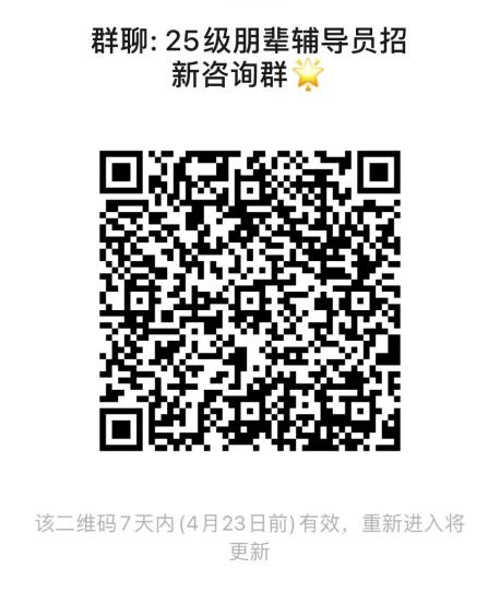 加入“2025级朋辈辅导员招新咨询群”,了解更多信息,接收后续安排通知。进群后请修改群昵称为真实姓名;