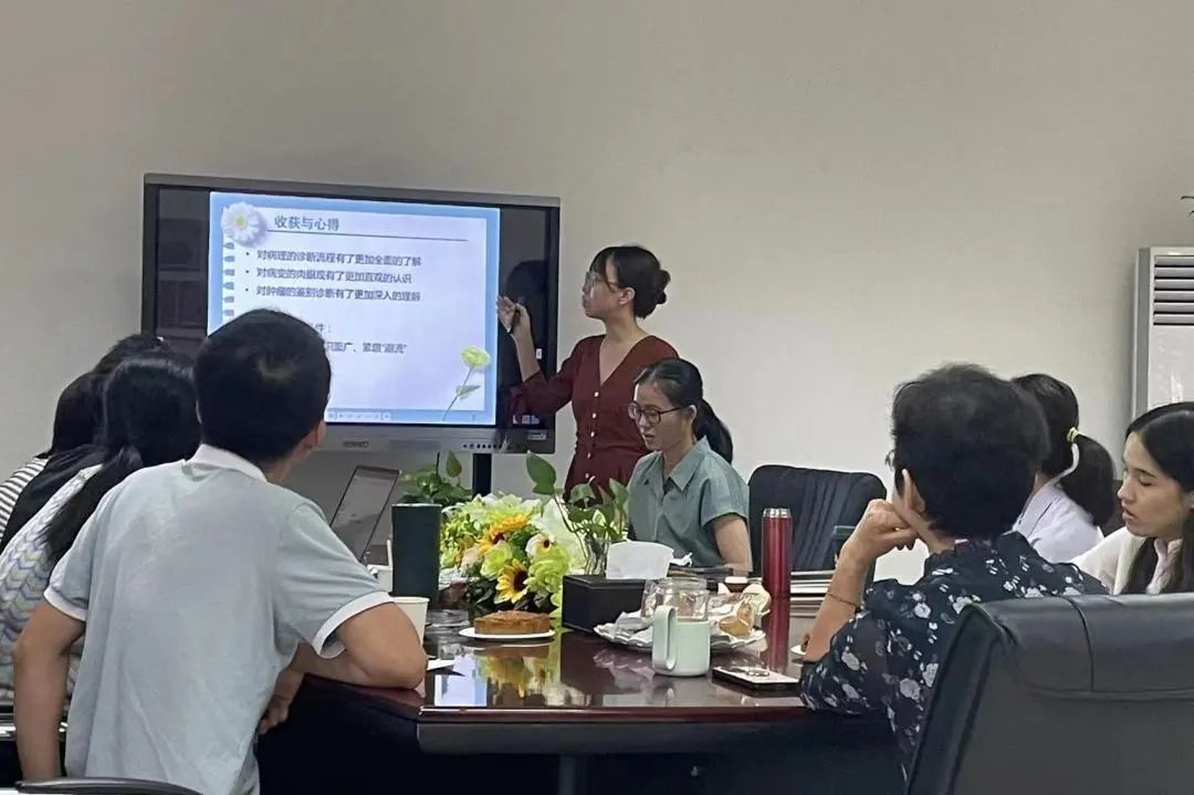 付雪老师总结分享了从“中医科”“儿科病房”“儿科门诊”“针灸科”四个科室进修的心得。付老师说到,在中医科进修时通过与教授和医生们交流学习,开阔了她的诊疗思路,认识到团队协作的重要性;她还参与了白血病患者家属的谈话,对白血病的分类、诊疗、化疗时间、化疗期间饮食方面的注意事项等有了更加清晰的学习,能更好的用于血液疾病方面的教学。