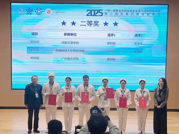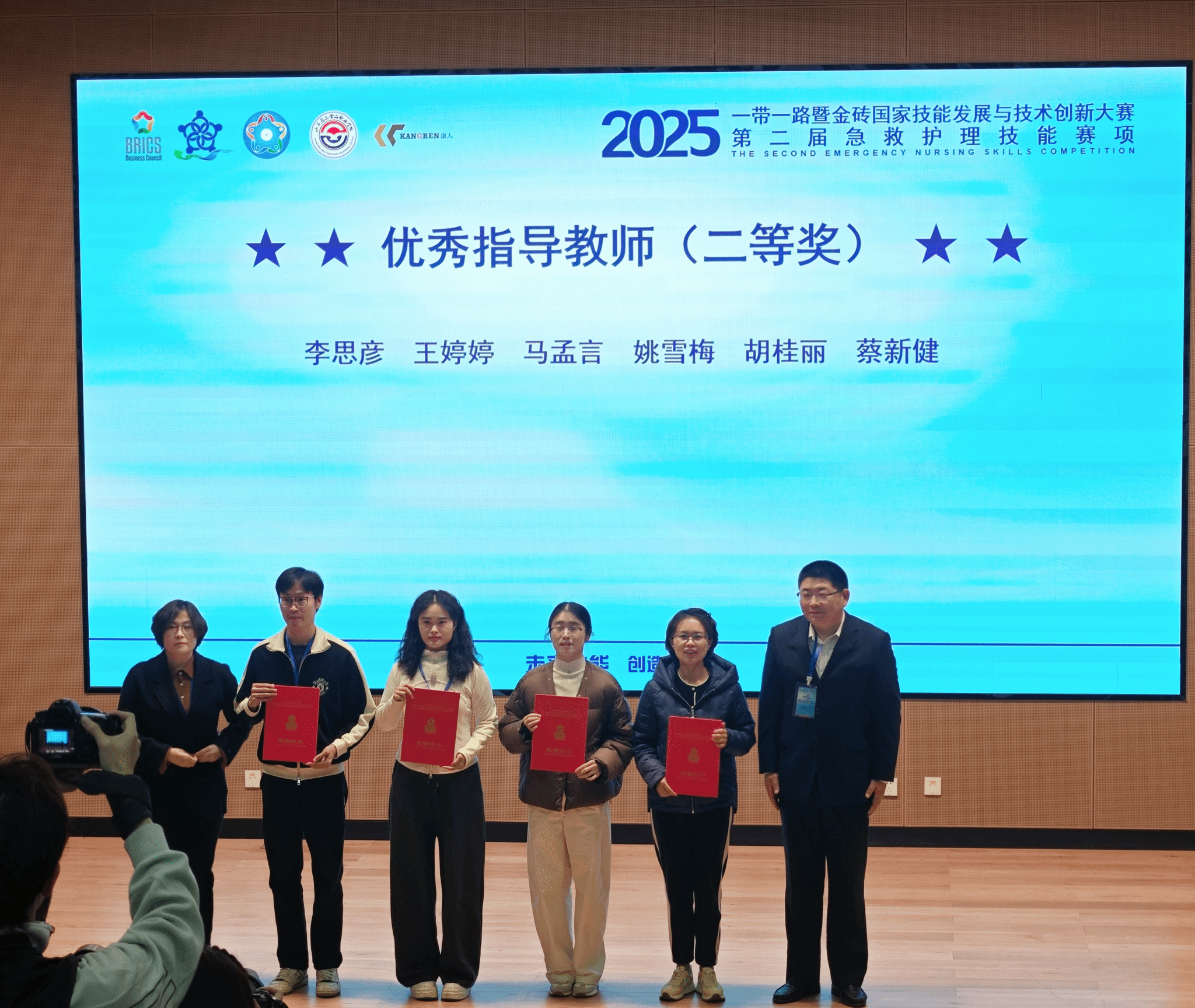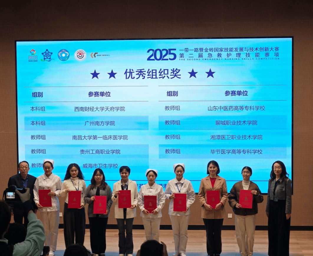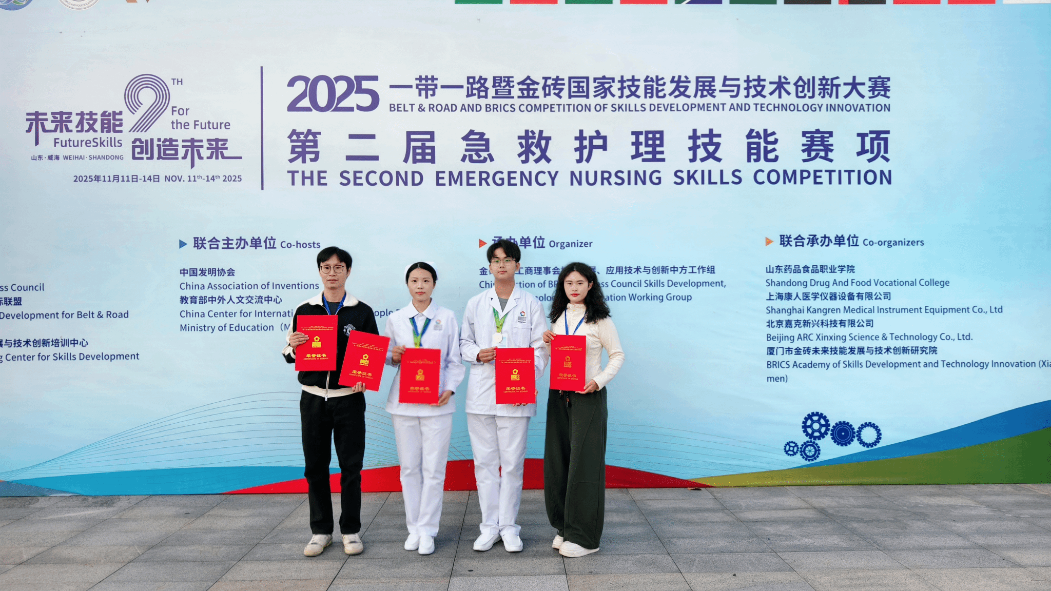 2025 年 11 月 10 日至 15 日,由金砖国家技能发展与技术创新大赛组委会主办的“2025 一带一路暨金砖大赛之第二届急救护理技能赛项”在山东药品食品职业公司圆满落幕。伟德betvlctor1949源于英国在徐晨副经理的统筹下,由胡桂丽、蔡新健老师担任指导教师,带领2023级员工潘恒翰、李梦如组成的参赛队伍,在全国众多优秀参赛队伍中脱颖而出,荣获本科组二等奖。胡桂丽、蔡新健老师获评优秀指导教师,公司斩获优秀组织奖,以亮眼成绩彰显了www.betvlctor1946.com护理教育的扎实根基与师生的卓越风采。