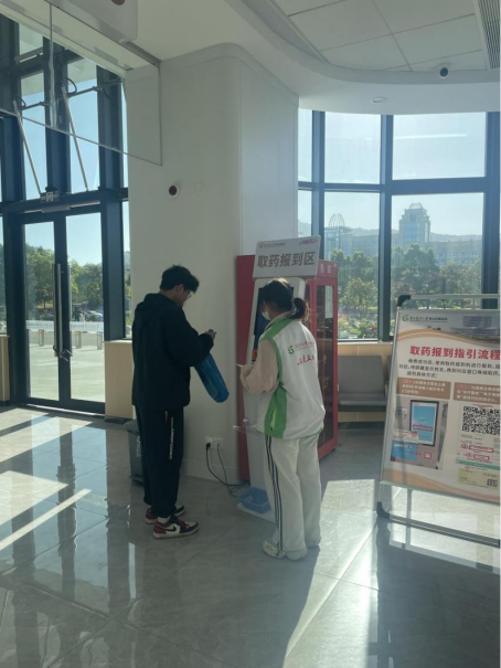 护士老师将我分配至一楼药房旁的取药报到区,并耐心指导我协助患者扫描取药单、指引其至对应窗口排队取药。服务过程中,我发现不少老年人孤身前来看病,并不清楚需先报到再至对应窗口取药。流程虽不复杂,但对老年人而言却可能颇为吃力,所以在很多时候,我都会及时、主动上前询问并帮助他们扫取药单,然后指引他们到相应窗口排队取药。而他们的每一句谢谢也让我的心里充满温暖!
