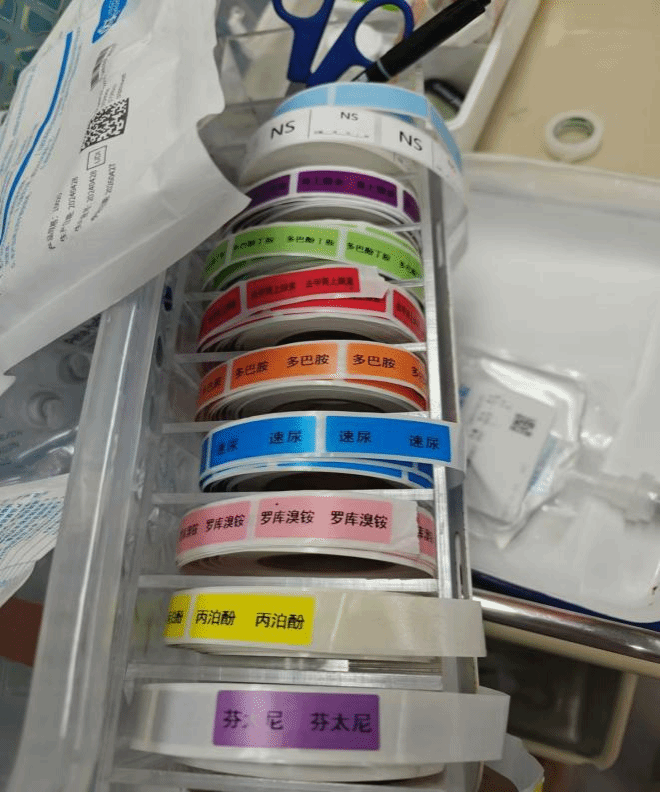 (PICU治疗车一角——输液管道标签)