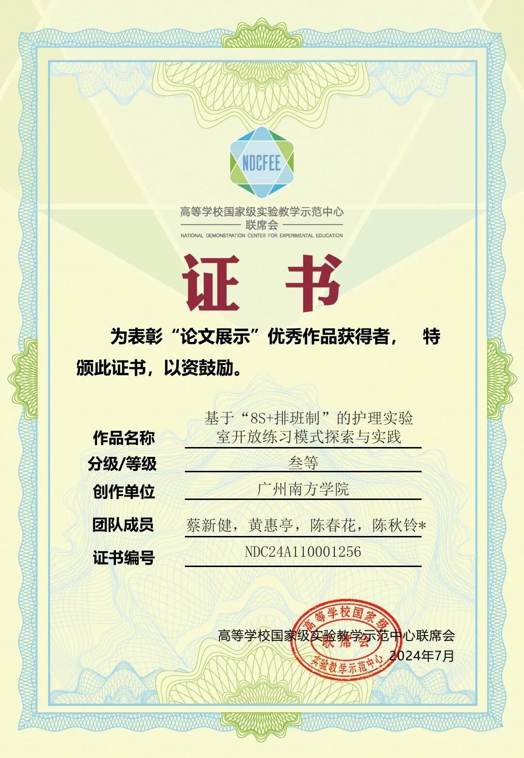 在研讨会同期举办的“高等公司医学基础类实验教学优秀论文展示”活动中,公司蔡新健老师、黄惠亭老师、陈春花老师和陈秋铃老师合作完成的论文《基于“8S+排班制”的护理实验室开放练习模式探索与实践》获得高等公司医学基础类实验教学优秀论文三等奖。