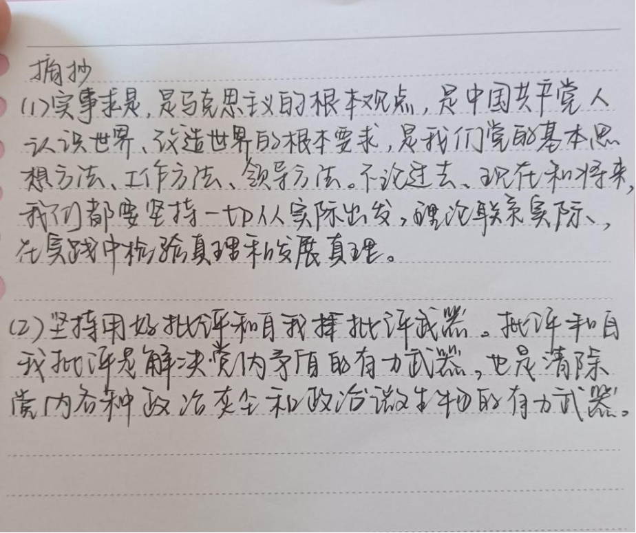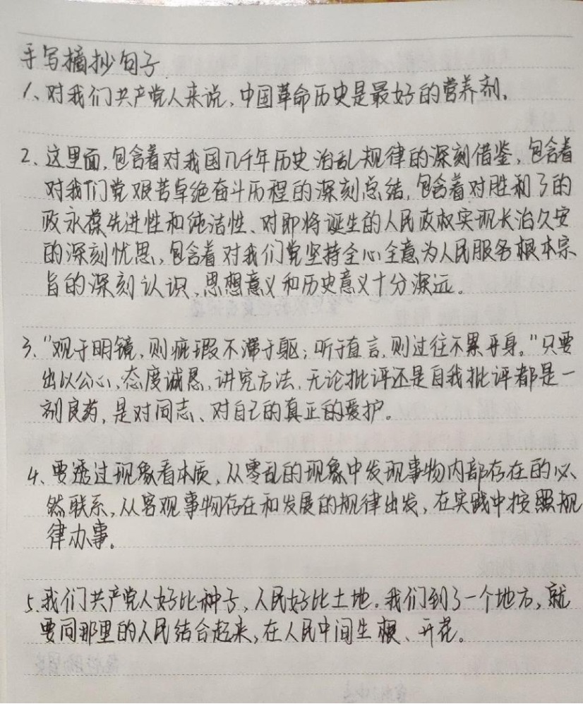 第四小组开展集体学习后,成员们选择句子摘抄和心得分享展开深入学习。通过学习《论党的自我革命》13-16章,认识了中国革命历史的重要性,群众路线是我们党的生命线和根本工作路线,是我们党永葆青春活力和战斗力的重要传家宝。