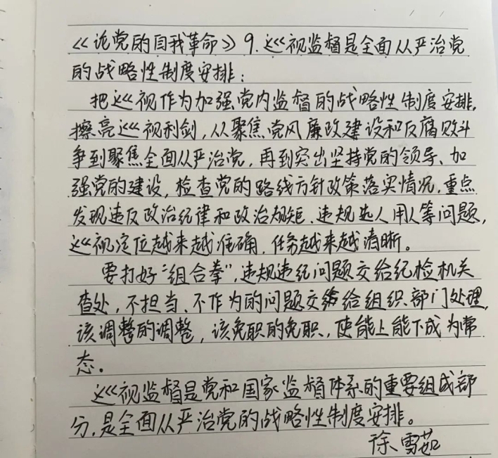 第三小组的成员们深入学习《论党的自我革命》9-12章,“守初心、担使命,找差距、抓落实”始终贯穿主题教育的全过程。小组学习之后,同学们纷纷写下心得与体会。