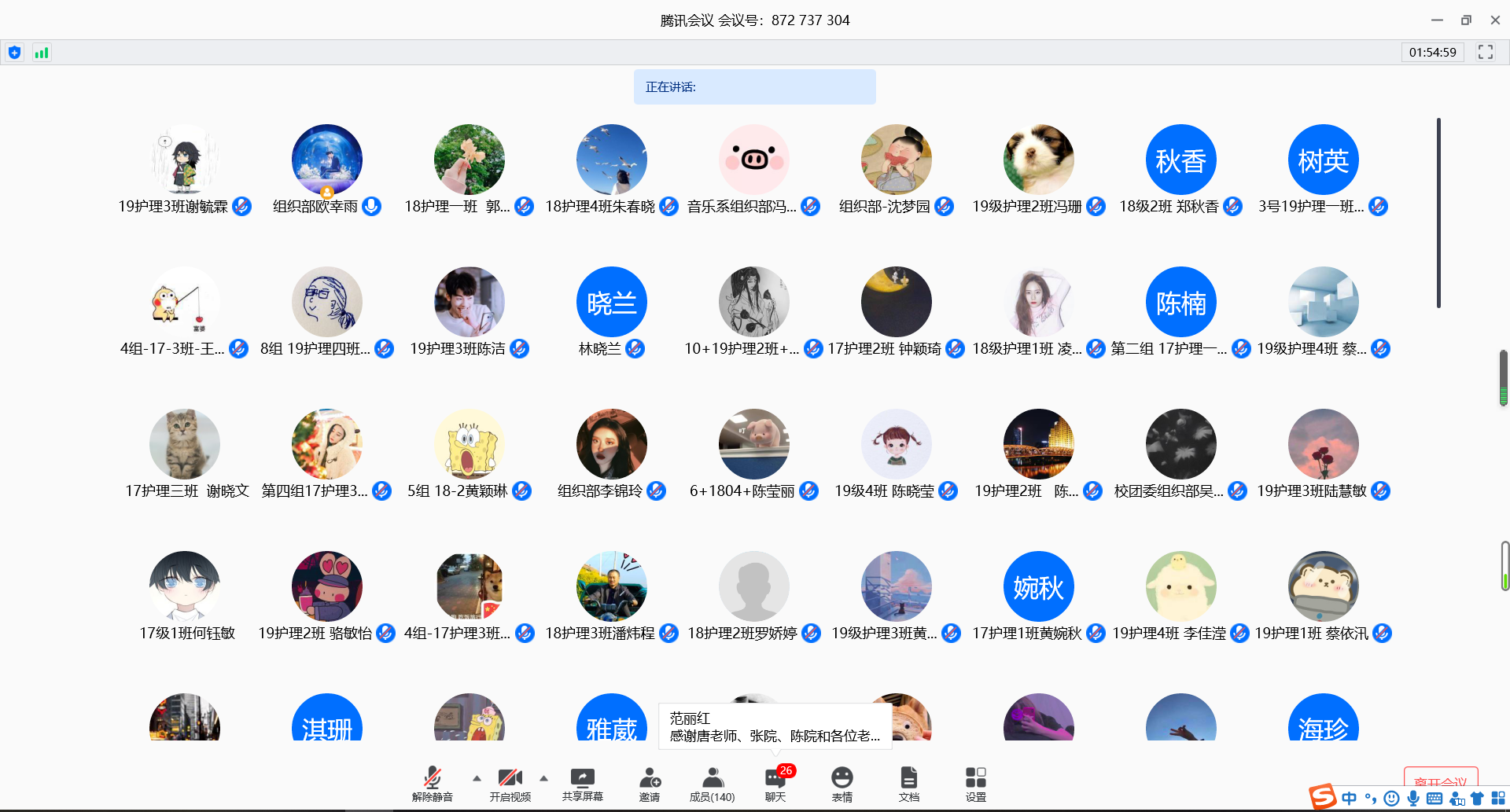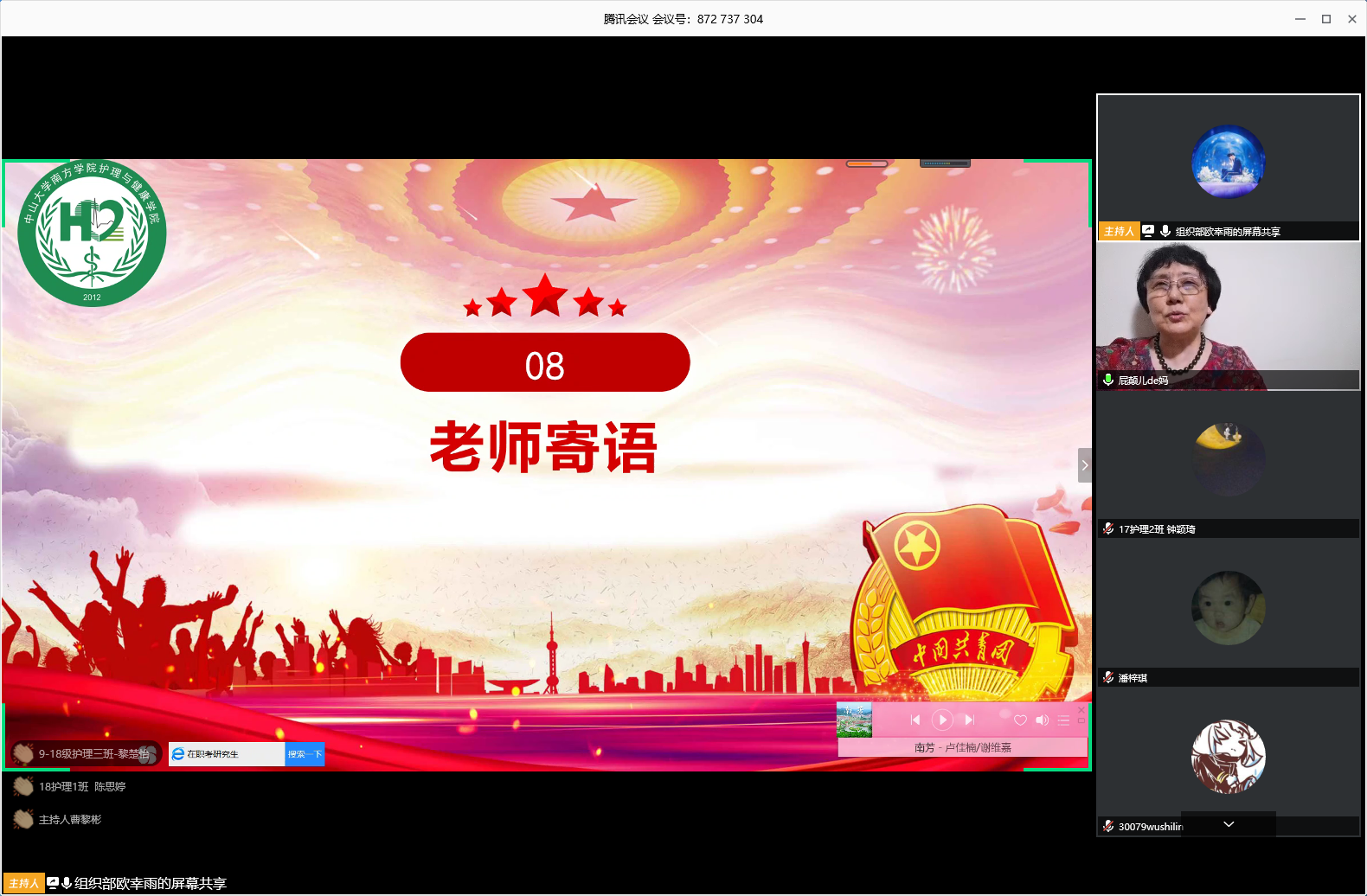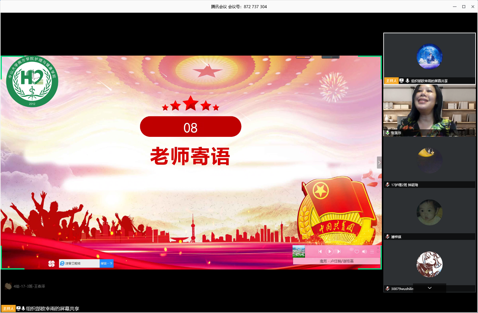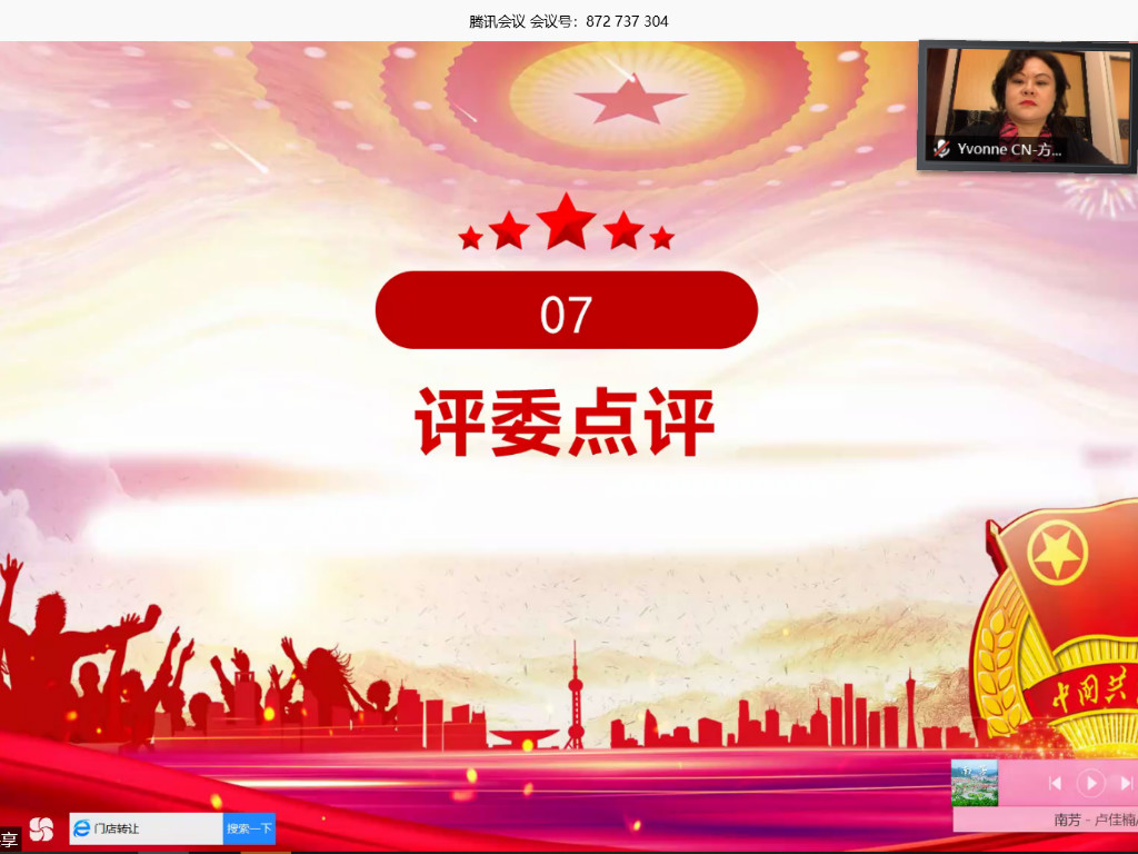 伴随着共青团团歌的奏唱,林晓兰老师为本次大会致辞。林老师说道,在疫情期间,公司各级团组织在党组织的带领下积极开展线上活动。在公司的领导下,团结广大青年党员、青年团员为打造南院特色贡献了自己的力量。通过此次会议,希望各团支部总结以往的经验与不足,互相交流学习,取其精华,去其糟粕,继承发扬五四精神,共同将团支部建设得更好。