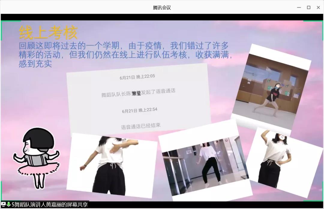 随后,各队伍开始汇报工作。其中,医疗队以“成员介绍、队伍工作、队伍日常、队伍总结及未来规划”四个方面展开汇报。从屏幕前一张张出现的照片中,该汇报人将医疗队和谐有爱的氛围传递到同学们的心里,同时也能看出其队员认真负责的工作态度。在本次疫情期间,其队员坚持打卡,认真学习医护知识,为日后队伍发展打下扎实的基础,其队员亦积极参与公司举办的活动,为处在抗“疫”一线的医护人员们献上祝福。在舞蹈队的汇报中,其队员对舞蹈队的热爱,令同学们赞叹不已。舞蹈队的主要职责是负责出席运动会、毕业典礼、拉拉操等活动的开幕式的舞蹈工作,由于新生军训的时间与啦啦操比赛的时间有冲突,其队员无法参加到比赛当中,但这并不影响其队员对舞蹈的热情。该汇报人总结了舞蹈队的优缺点,规划其队伍的未来。最后,她相信舞蹈队能够完善其不足之处,增强责任心,奋发进取,将舞蹈队的工作做得更好。
