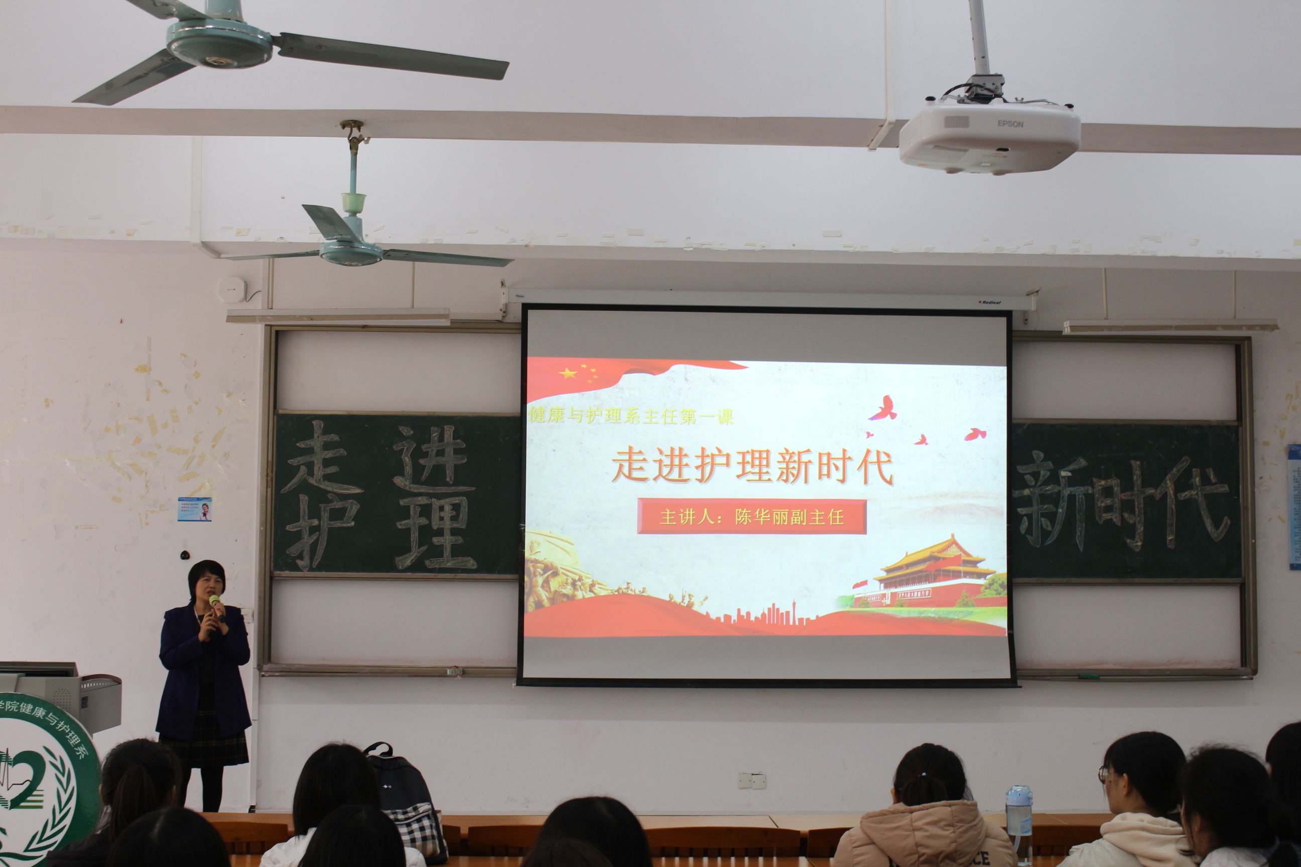 为深入贯彻落实全国教育大会习近平总书记重要讲话精神,培养员工成为德业双修”的新时代的护理人,2月27日中午12点30分,健康与护理系于5教205开展了新学期主任第一课,我系陈副主任为同学们作了题为“走进护理新时代”的专题讲座。健康与护理系两办教师和部分专业教师到场聆听,2016级、2017级和2018级的全体同学积极参与,全场座无虚席。