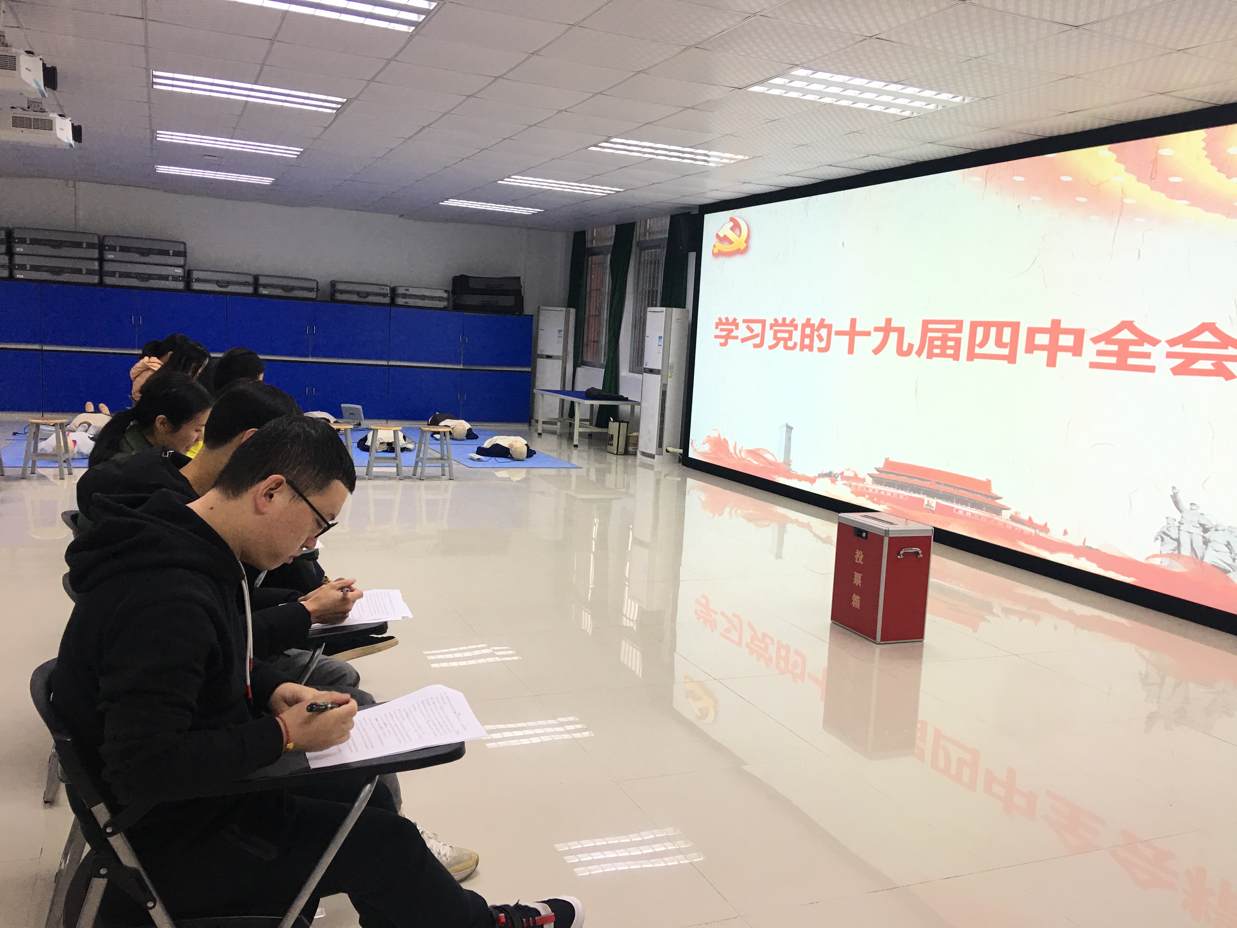 与会党员同志认真学习了党的十九届四中全会相关内容,认真研读了《中共中央关于坚持和完善中国特色社会主义制度、推进国家治理体系和治理能力现代化若干重大问题的决定》。随后,教工党支部通过组织线下考学方式来巩固党员同志们的学习效果,与会同志在40分钟内完成了测试,平均分为97分。通过此次专题学习,各位党员同志进一步理解了十九届四中全会的精神内涵,主动自觉参与“读原著、学原文、悟原理”主题学习活动的积极性高涨。