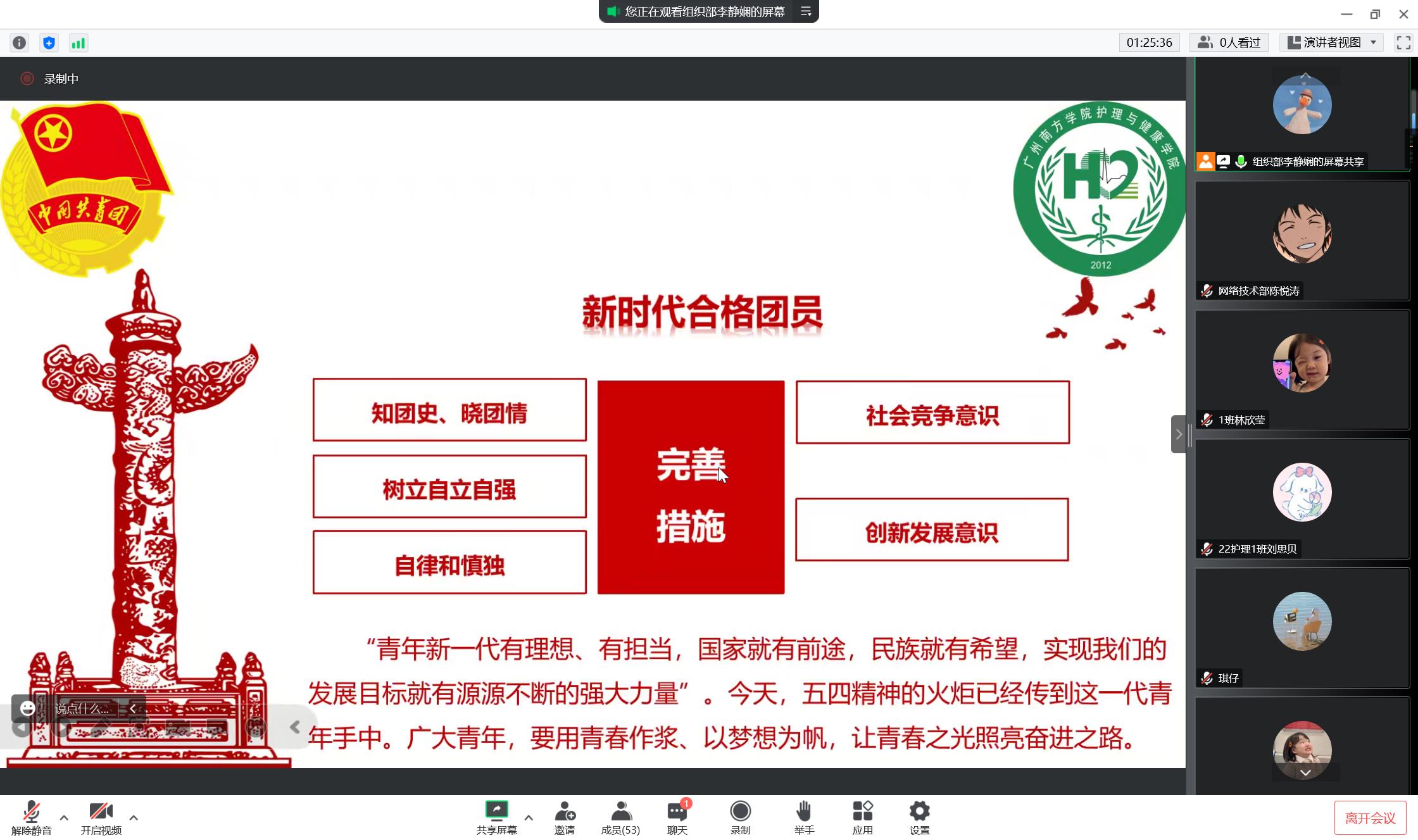 李静娴同学播放建团百年视频,展现团组织百年奋斗征程,结合观频,引导同学们进行深入思考,讨论与分享如何做一名合格的共青团员。她指出,作为新时代合格团员,要知团史、晓团情、树立自立自强精神、做到自律和慎独,培养社会竞争意识和创新发展意识。