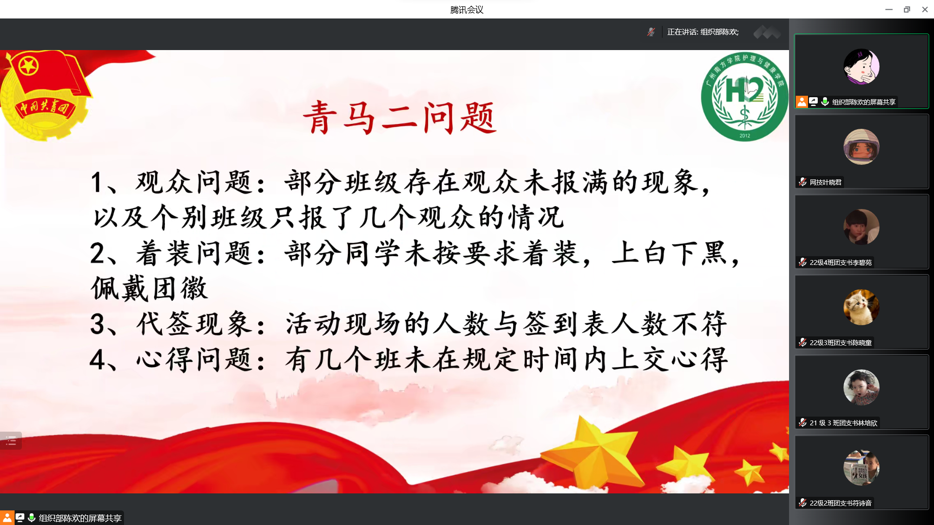 陈欢同学围绕“第二期青马工程第二讲问题”“入团推优”“团日活动”“团支书工作基础评分表”四个部分展开讲解。她总结了青马工程出现的问题,如观众未报满、着装不规范、代签和未按时上交心得等,要求团支书做好表率,发挥引领作用,增强班集体的凝聚力。
