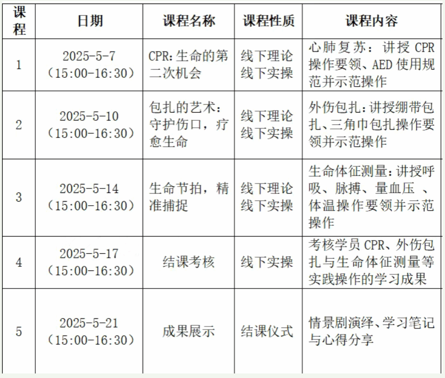 课程内容不仅涵盖基础理论知识,而且结合生活急救常识、心肺复苏及外伤急救等实用技能,重点讲授胸外按压、绷带包扎等急救技术。还有生命体征课程的教学,学员将系统学习体温、脉搏、呼吸、血压的测量方法,掌握体格检查的基本技能。