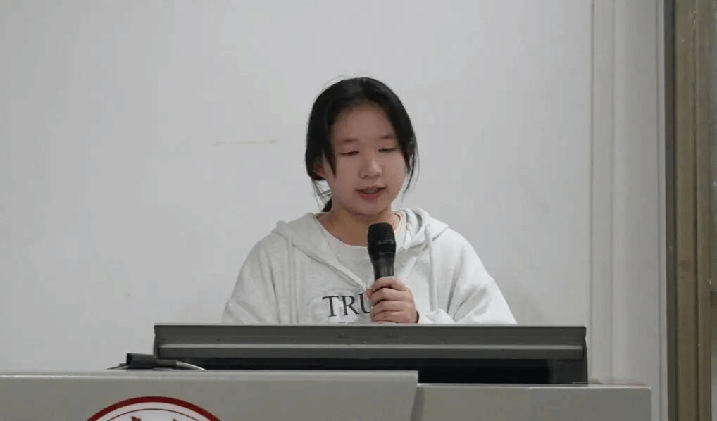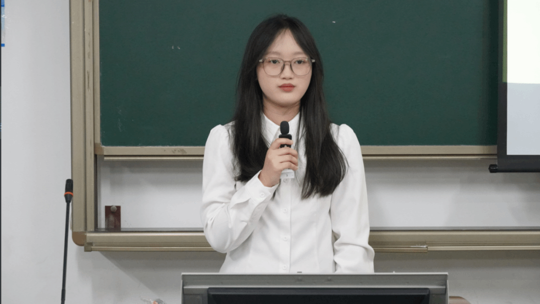 易桂婵同学引用习近平总书记对红色基因传承的重要论述,向入团积极分子们阐述传承红色基因的重要性。她从红色薪火的意义、红色革命故事、革命精神的核心内涵、革命精神的时代价值四个方面展开讲解,强调革命传统教育和爱国主义教育在培育时代新人方面的重要作用。她通过引导式提问,为入团积极分子讲述了践行革命精神的路径和方法。她希望入团积极分子们能够坚定理想信念,积微成著,不断锤炼品德修为,成为有担当的时代青年。
