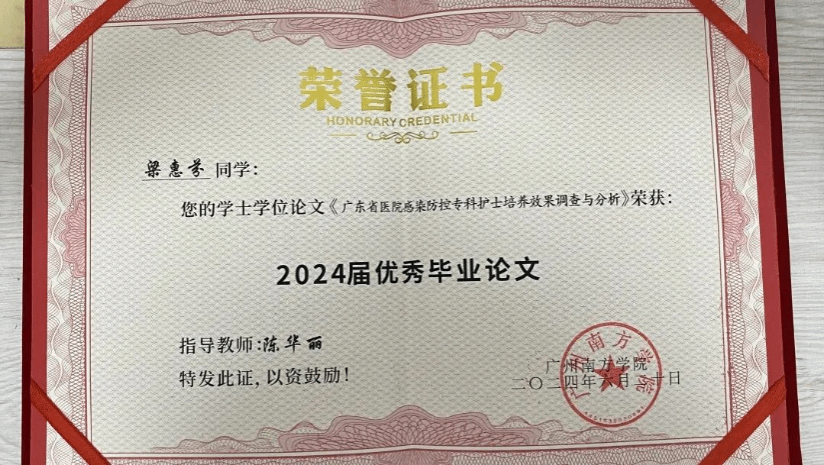 专业绩点排名前十,连续三年获得优秀员工奖学金三等奖。在校期间获广东省第九届“联盟杯”本科高校英语写作大赛校级二等奖、伟德betvlctor1949源于英国第一届“好书伴我行”手抄报比赛三等奖、www.betvlctor1946.com2021年学习党的十九届六中全会精神“手抄报”比赛二等奖等,毕业论文《广东省医院感染防控专科护士培养效果调查与分析》获www.betvlctor1946.com2024届优秀毕业论文。