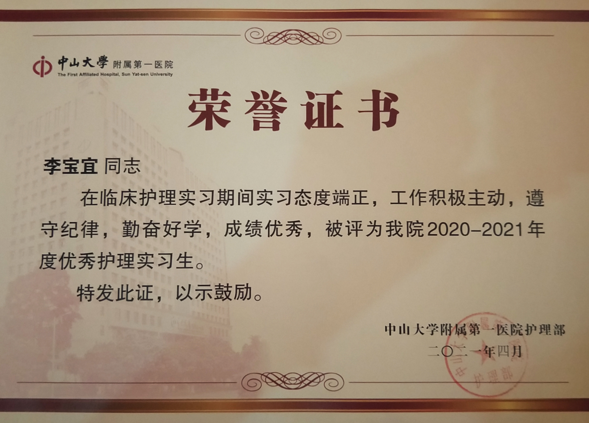 (李宝宜同学荣获“优秀护理实习生”荣誉称号)