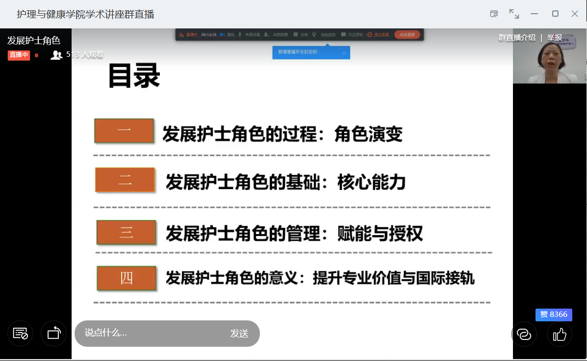 覃惠英教授的讲座主要包括四大方面:发展护士角色的过程--角色演变、 发展护士角色的基础.......补充。覃惠英教授通过护士传统角色引出了现代护士的基本角色、发展角色和拓展角色。覃教授表示,通过社会对护士角色期待值的提升,说明护士必须具有扎实的专业能力和优良的职业素养。她强调,发展护士角色的基础是护士核心能力的提升。她还解释了香港护理专科公司APN核心能力的七个领域,分别是处理病人复杂的健康问题、提升护患间的治疗关系、有效的领导和团队合作、加强和改进质量保证、管理和商讨找出保健服务的创新和有效的方法、强化通用专业素质和高级实践以及增强个人素质。
